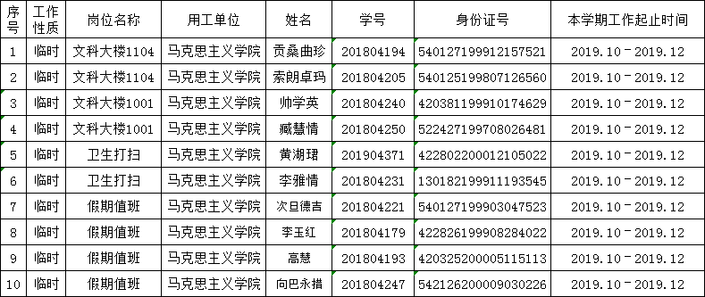 为帮助家庭经济困难学生顺利完成学业,提升学生实践能力和综合素质,培养学生自立自强精神,同时为保障学院教学、学生管理和教育工作的有效顺利运行,经学生本人申请,院系考核,依据工作实际需要,拟聘用10名学生参与2019-2020学年上学期的勤工助学工作。现将岗位设置和人员聘用情况公示如下: